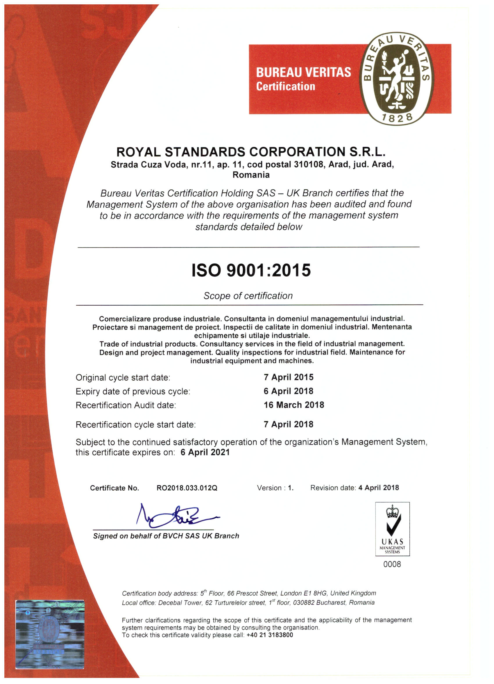 Royal Standards Corporation SRL are un Sistem de Management al Calitatii, certificat in conformitate cu cu cerintele standardului ISO 9001:2015, de catre Bureau Veritas Certification, pentru: